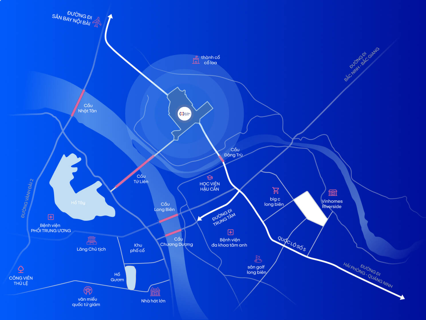 Tâm điểm phía Đông Bắc liền kề lõi trung tâm Thủ đô. Siêu kết nối nhanh chóng tới sân bay Quốc tế Nội Bài, trung tâm Hà Nội và vùng kinh tế trọng điểm miền Bắc: Hải Phòng, Quảng Ninh, Bắc Ninh, Bắc Giang, Thái Nguyên…