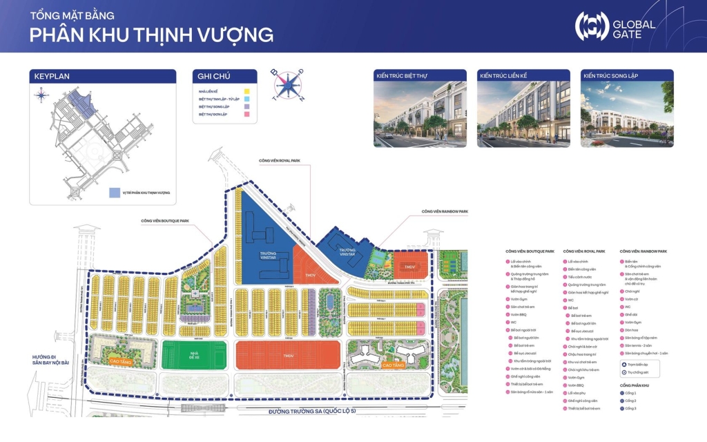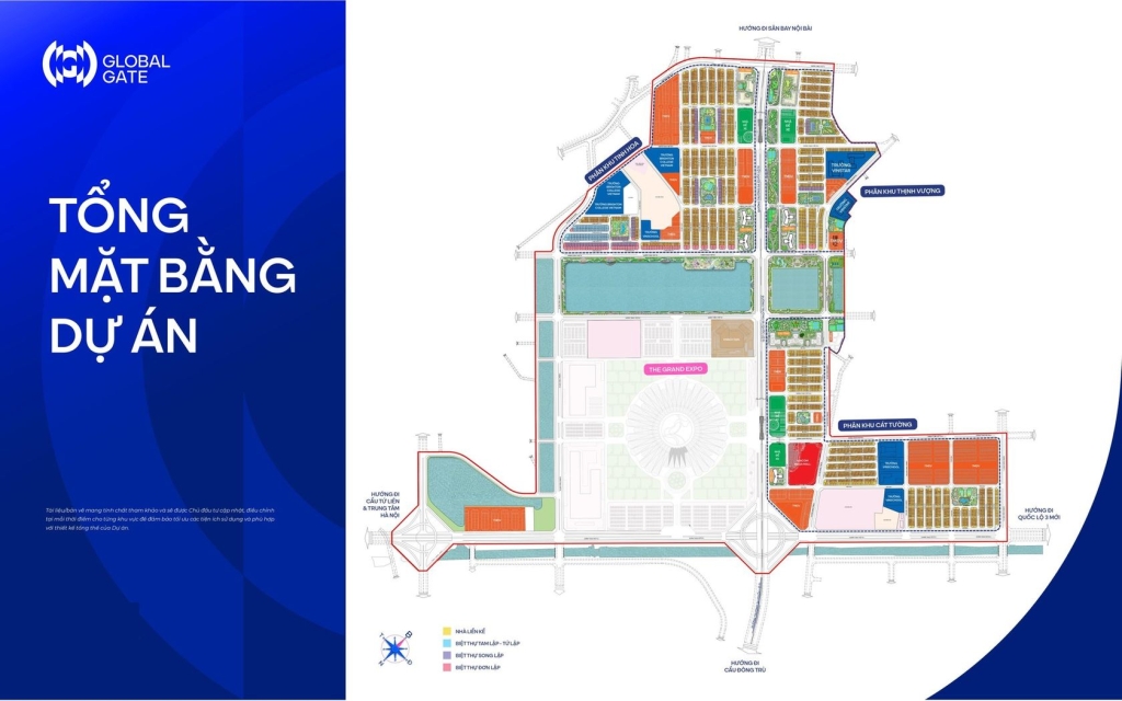Mặt bằng Global Gate có tổng diện tích lên tới 385ha với mật độ xây dựng chỉ 28,5%, còn lại phần đất dành cho không gian cảnh quanh, công viên cây xanh và sông nhân tạo. Vì vậy số lượng căn thấp tầng của dự án là thấp, đâu đó chỉ có hơn 3000 căn chia làm 3 phân khu: Tinh Hoa, Thịnh Vượng và Cát Tường. Dự án được quy hoạch bài bản, bố trí các hạng mục nhà ở và tiện ích khoa học để đảm bảo đem đến sự thuận tiện nhất cho cư dân.